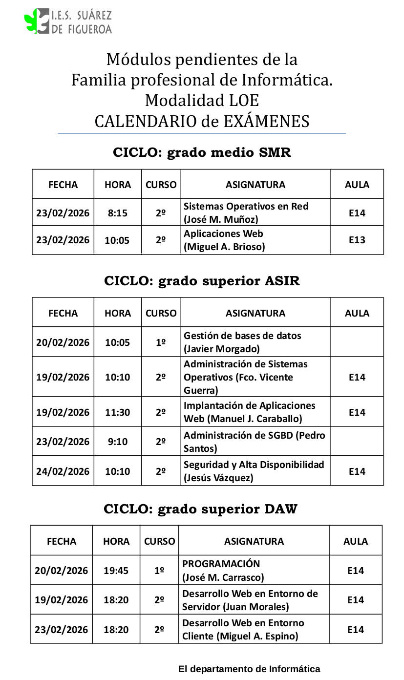 Para el título de ASIR (Administración de Sistemas Informáticos en Red) las pruebas tendrán lugar en el IES Suárez de Figueroa, y la bibliografía recomendada y las características de las pruebas son: