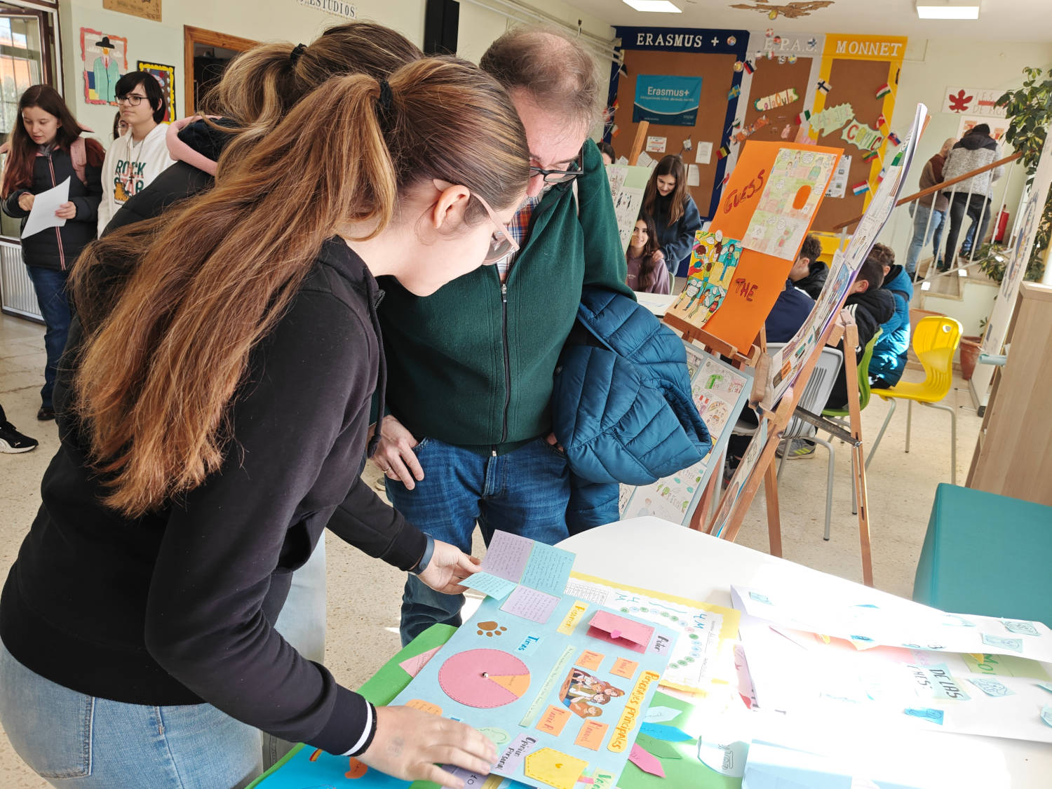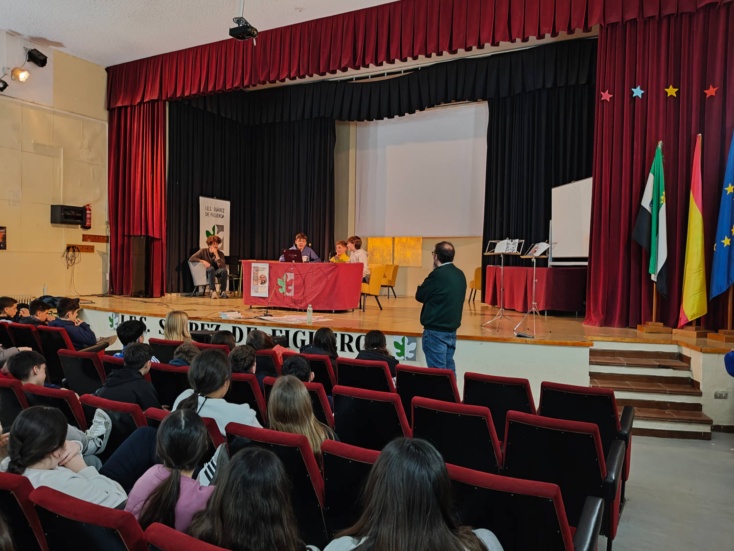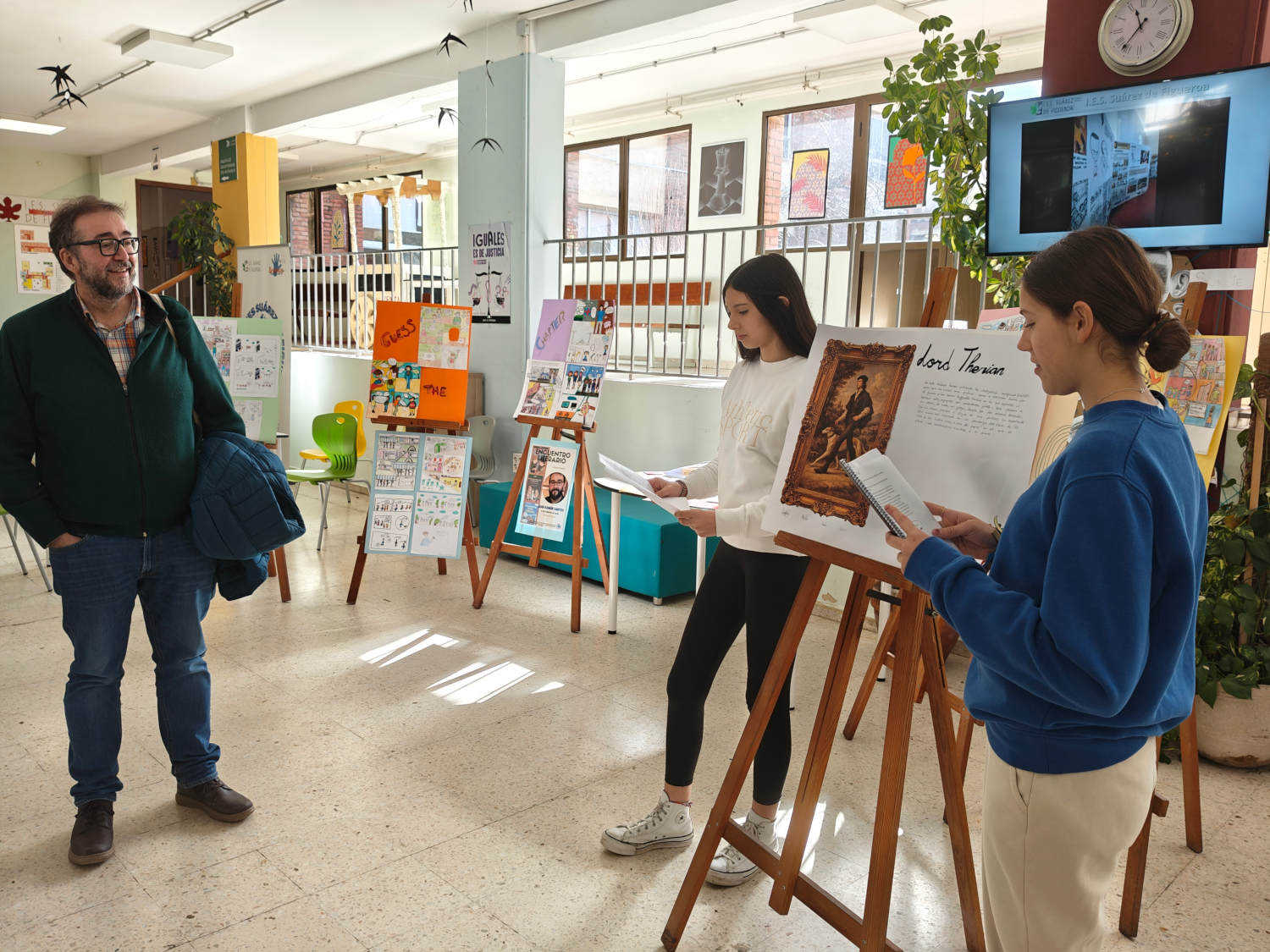 Durante el encuentro, nuestro alumnado de 1º y 2º de ESO pudo disfrutar de una charla cercana y enriquecedora, en la que el autor compartió su experiencia y su pasión por la literatura. Además, los estudiantes tuvieron la oportunidad de mostrarle algunos de los trabajos que han realizado con gran dedicación e ilusión, como cómics, lapbooks y cuadros, generando un intercambio muy especial.