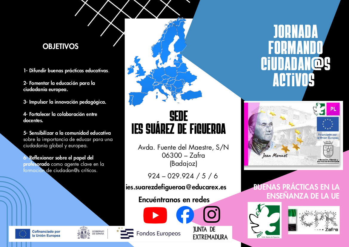 El IES Suárez de Figueroa celebró el pasado 21 de marzo la jornada “Formando Ciudadan@s Activos: buenas prácticas en la enseñanza de la Unión Europea”, organizada en colaboración con el CPR de Zafra. La iniciativa reunió a cerca de medio centenar de docentes interesados en impulsar la dimensión europea en los centros educativos.